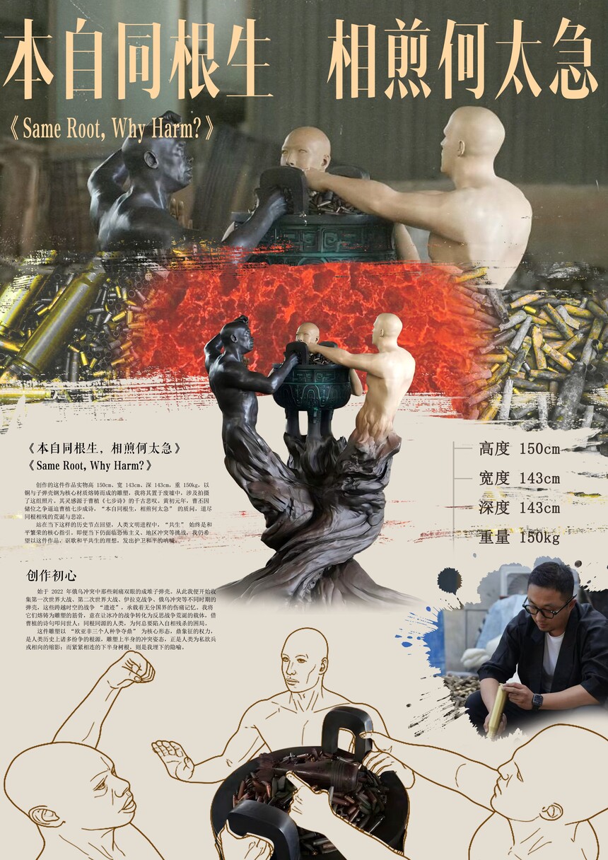 邱天仁将它们熔铸为雕塑的筋骨,意在让冰冷的战争转化为反思战争荒诞的载体,借曹植的诗句叩问世人:同根同源的人类,为何总要陷入自相残杀的困局。