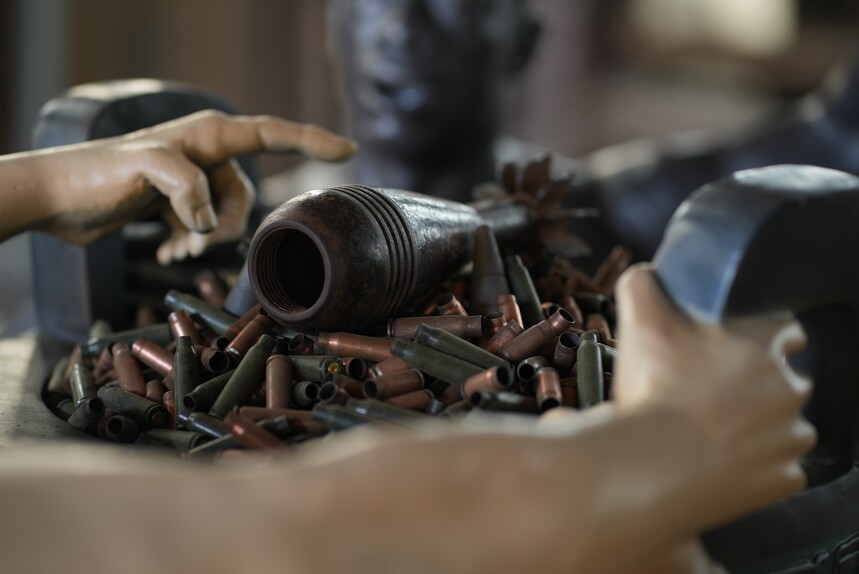 邱天仁的创作初心,始于 2022 年俄乌冲突中那些刺痛双眼的成堆子弹壳。他收集了第一次世界大战、第二次世界大战、伊拉克战争、俄乌冲突等不同时期人类战争遗留下来的弹壳,这些跨越时空的战争 “遗迹”,承载着无分国界的伤痛记忆。