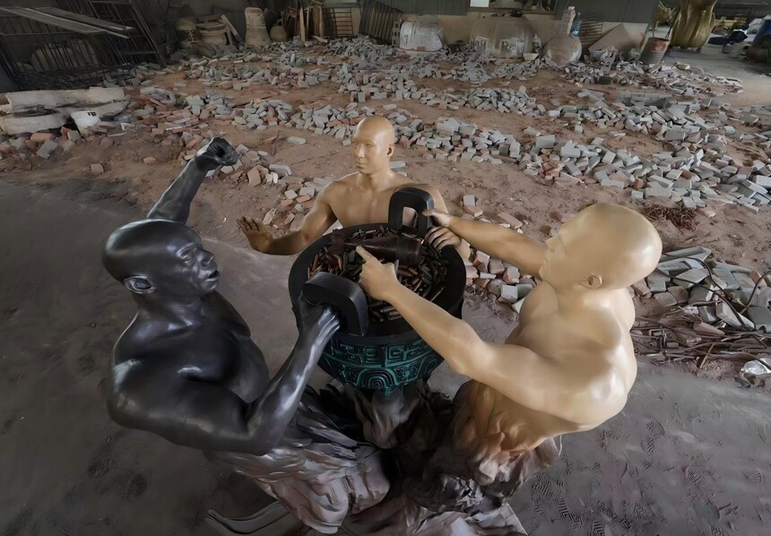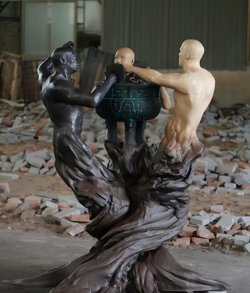 这件雕塑以 “欧亚非三个人种争夺鼎” 为核心形态,鼎象征的权力,是人类历史上诸多纷争的根源,雕塑上半身的冲突姿态,正是人类为私欲兵戎相向的缩影;而紧紧相连的下半身树根,则是邱天仁埋下的隐喻 —— 人类本就同根同源,命运休戚与共。